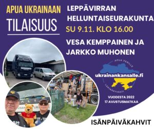 Su 9.11 klo 16 Apua Ukrainaan -tilaisuus, Vesa Kemppainen ja Jarkko Muhonen Pihtiputaalta https://ukrainankansalle.fi/ ,mus. Tero Huvi, Isänpäivä-kahvit